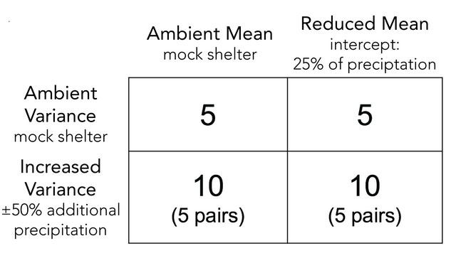 To increase variance in soil moisture (θ) stochastically, without changing the mean, we pair plots and amplify their precipitation regimes. Every water year, plots within a pair are randomly assigned to either a 50% decrease or 50% increase in precipitation. To reduce the long-run mean soil moisture (θ), we use roof panels to intercept 25% of precipitation year-round, a moderate forcing within the range of likely climate futures. Control plots receive similar shelters but with panels that allow precipitation throughfall. Plots receiving both reduced mean and increased variance randomly alternate between 75% less net precipitation (-25% for mean – 50% for variance) or 25% more (-25% for mean + 50% for variance). Replication is uneven to account for higher variability among plots in the increased variance treatment.