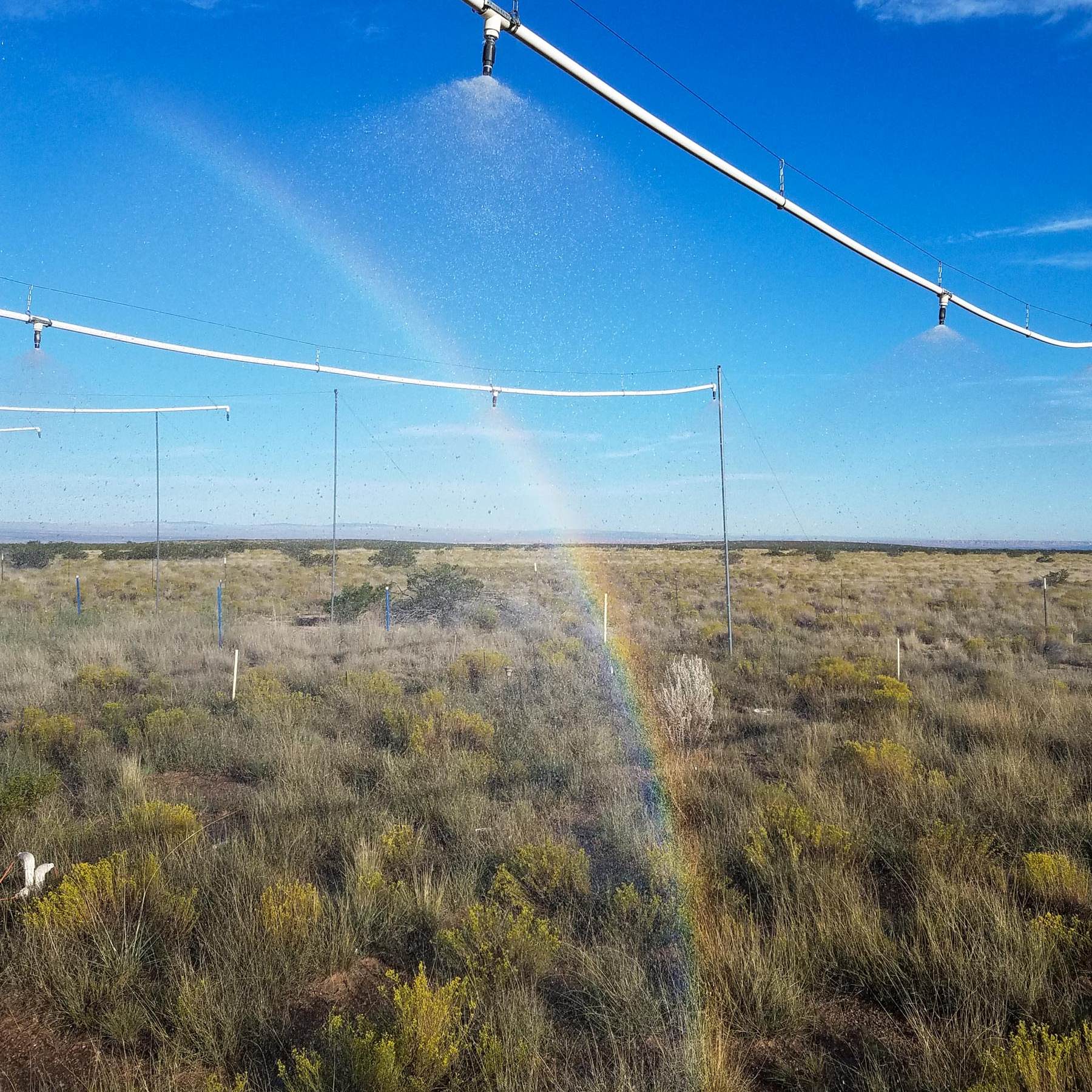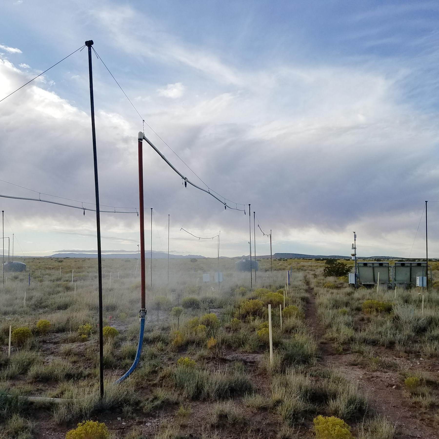 MRME research site, showcasing overhead sprinkler system, water tanks, water delivery, and “rainfall events” in action.