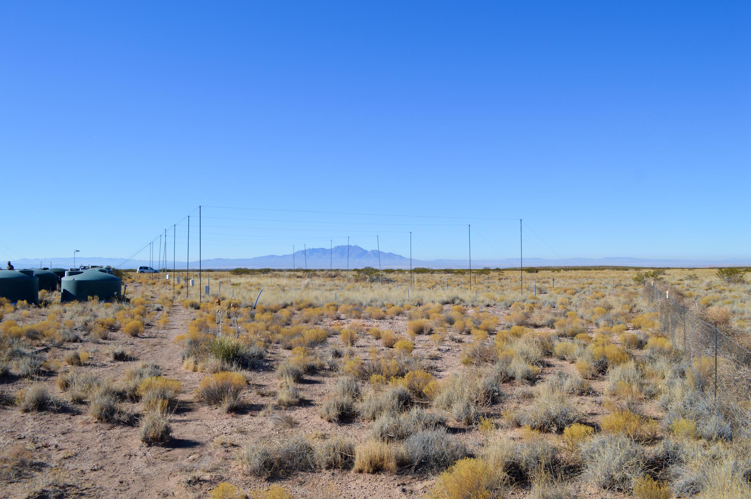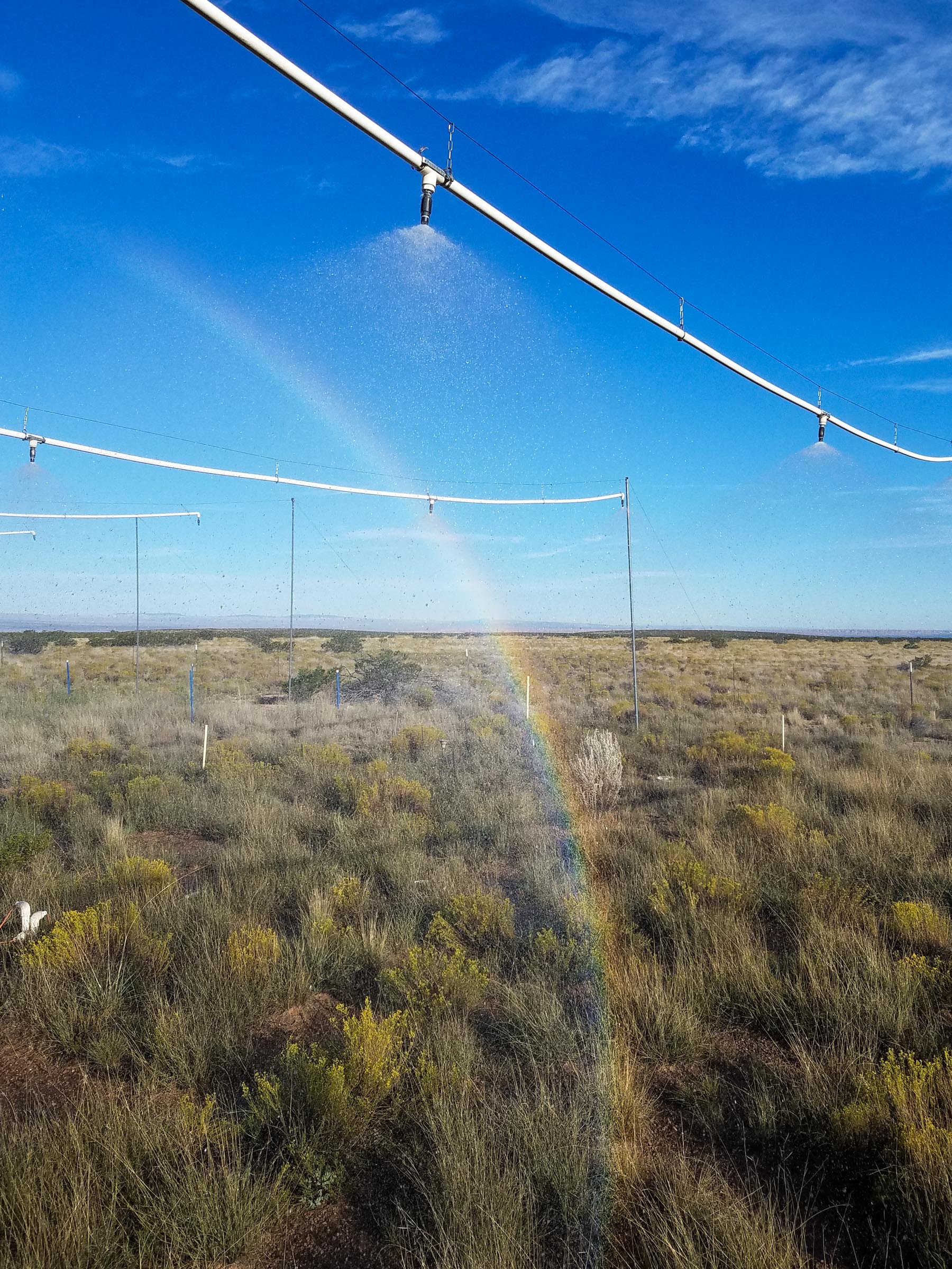 We manipulate rainfall event size and frequency using a fully randomized design with a total of thirteen 8 m x 13 m plots. Control plots (n=3) receive ambient precipitation. Two rainfall treatments (n=5) are applied each year during the monsoon. The Few-Large treatment receives ambient rainfall plus one 20 mm rain event each month (i.e., increased rainfall event size). The Many-Small treatment receives ambient rainfall plus four 5 mm rain events each month (i.e., increased rainfall event frequency). Thus, we add the same amount of rain over the monsoon season (60 mm), but we vary the size and frequency of applied precipitation events, increasing variability without imposing unrealistically extreme rainfall amounts. The overall precipitation added per monsoon season is equivalent to an increase of ~40% over an average year (long-term monsoon mean ~150 mm). The 20 mm events simulate more extreme precipitation events, and the 5 mm events represent modal precipitation event size. On average, 70% of natural precipitation events are <5 mm and 12% are between 10 – 20 mm (1988–2008). On August 4, 2009, a lightning-initiated fire began on the Sevilleta National Wildlife Refuge near MRME. The experimental site was entirely burned on this date, with all plots subjected to high intensity wildfire.