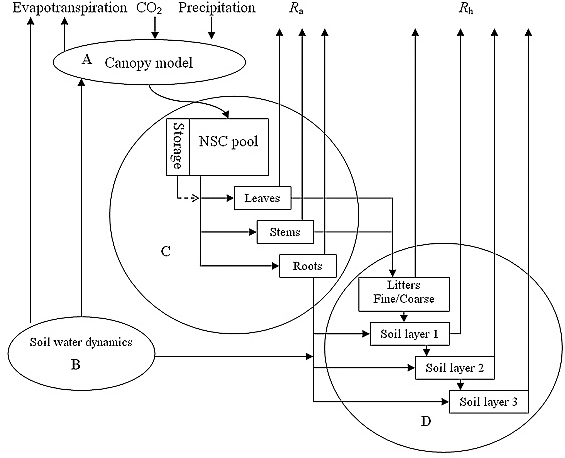 TECO is a typical terrestrial ecosystem model that simulates biophysical and biogeochemical processes in ecosystems. TECO has five major components: (1) canopy photosynthesis, (2) soil water dynamics, (3) plant growth, (4) litter and soil C decomposition and transformation, and (5) N dynamics. Canopy photosynthesis is derived from a two-leaf (sunlit and shaded) model that simulates canopy conductance, photosynthesis, and partitioning of available energy. In the soil water dynamic submodel, soil is divided into 10 layers. Soil water content of these layers is determined by the mass balance between water influx and efflux. The plant growth submodel simulates carbon allocation and phenology. Allocation of the carbon among different plant components depends on their growth rates. Phenology is related to leaf onset, which is triggered by growing degree days, and leaf senescence, which is determined by temperature and soil moisture. The transfer submodel estimates carbon transferring from plants to litter and three soil layers. The nitrogen submodel is fully coupled with carbon processes with one additional mineral N pool. N is absorbed by plants from mineral soil and partitioned among leaf, woody tissues, and fine roots. N in plant detritus is transferred among different ecosystem pools (i.e. litter, fast, slow and passive SOM). The model is driven by climate data (including air and soil temperature, vapor-pressure deficit, relative humidity, incident photosynthetically active radiation, and precipitation) at hourly steps.